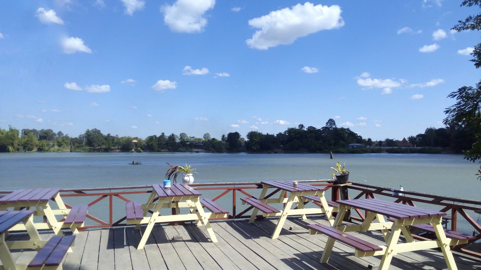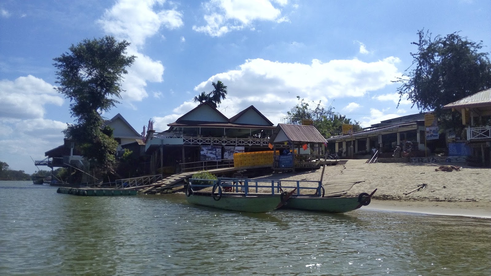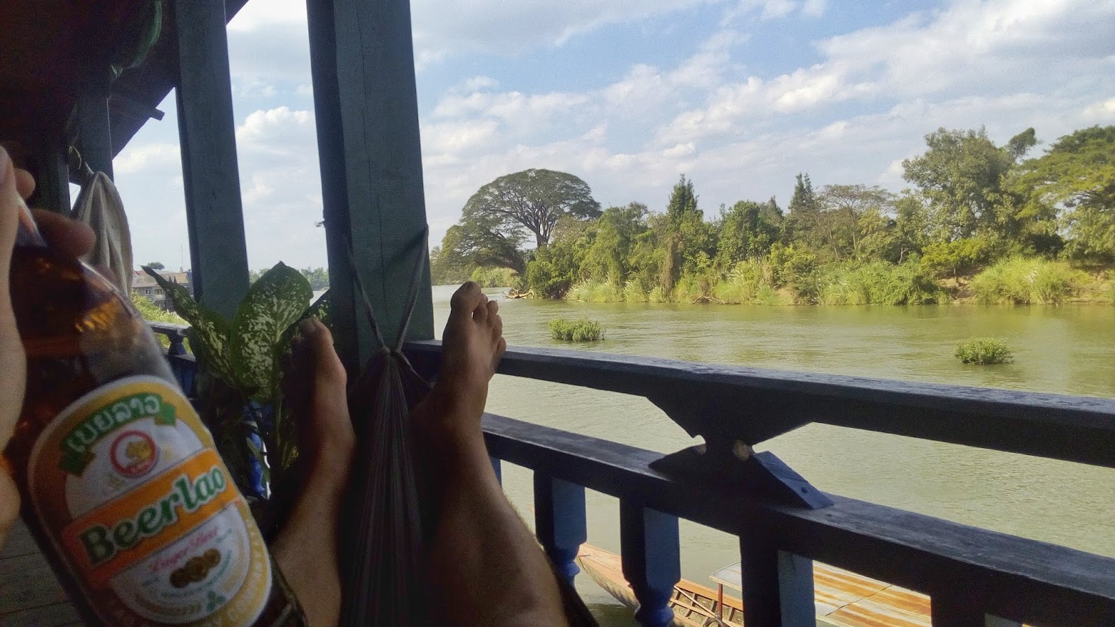 Sunce je bilo prejako, a voda prehladna za moj ukus, ali lokacija je bila toliko lijepa da je bio gušt ležati na pijesku dok slušaš zvuk slapova odmah iza ugla. Morao sam se zbog vrućine malo oplahnuti u hladnoj vodi i nakon sat vremena ipak sam nastavio dalje, na krajnji jug otoka Khon, gdje se nalazi selo Hang Khon. Tu sam imao ručak s pogledom na donji dio Mekonga gdje se najčešće mogu vidjeti oni delfini, ali i na manje od kilometra udaljenu obalu Kambodže.